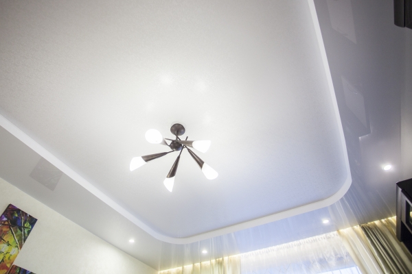 Также с помощью натяжного потолка легко зонировать пространство, выделяя центральную часть комнаты глянцевой пленкой. Она хорошо отражает не только свет, но и предметы, а потому визуально делает комнату больше.